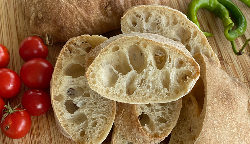Bu tarifle starter (bir gün ya da bir gece önceden hazırlanan bir tür ek mayalı hamur gibi düşünülebilir) kullanmadan, daha hızlı ve pratik bir yöntemle, içi-dışı harika pişmiş; dışı ince bir kabuk ve içi baloncuk dolu ideal ciabatta’ya ulaşıyoruz.