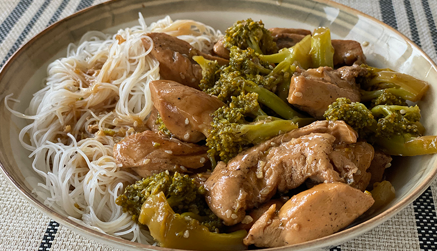 Bir karıştırma kabına soya sosu, tavuk suyu ya da su, mısır nişastası, şeker, susam yağı ve karabiberi ekleyin ve tüm malzeme iyice özleşene kadar karıştırın ve bir kenara ayırın.