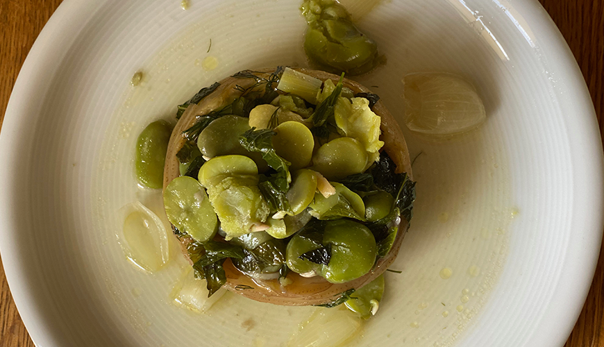 Son olarak, ayıklanmış iç baklaları, taze soğanların yeşil yerlerini ekleyip kapağı kapatın ve son 5 dakikalık pişirmeyi yapın.