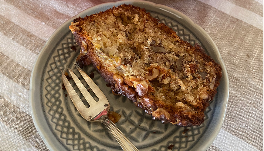 Karışımı kek kalıbına dök. Kalan ½ bardak ceviz ve dilimlenmiş muzla (tercihe bağlı)) üzerini süsle.