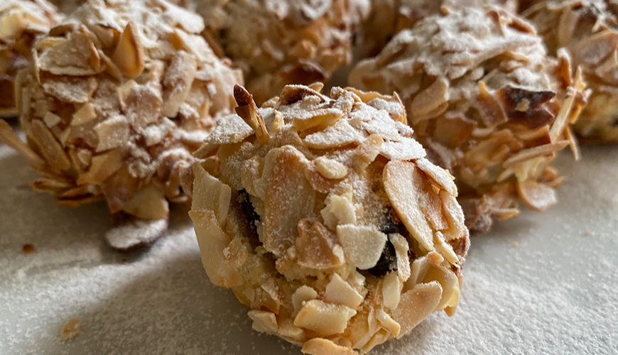 Bir kaşık/dondurma kaşığı/el ile hamurdan minik toplar alıp yumurta akının içine bırakın ve iki çatal yardımı ile her yerini yumurta akı ile kaplayın. Kurabiye toplarınızı daha sonra file bademle kaplayın ve aralıklı olarak yağlı kâğıt serili tepsiye dizin.