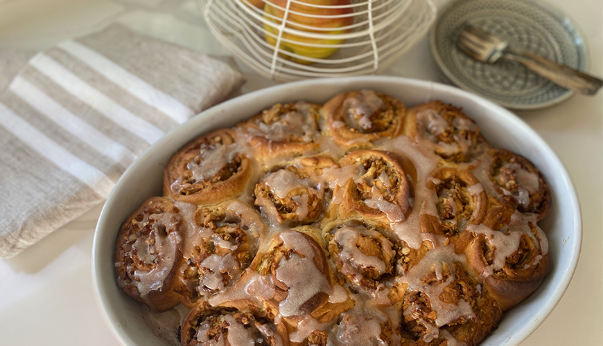 Gazını almak için hafifçe yoğurun ve dikdörtgen şeklinde, mümkün oldukça eşit kalınlıkta açın (yaklaşık 30x45 cm). Ardından sıra ile hamurun her yerine eşit şekilde elmalı karışımı ve çekilmiş cevizi yayın.