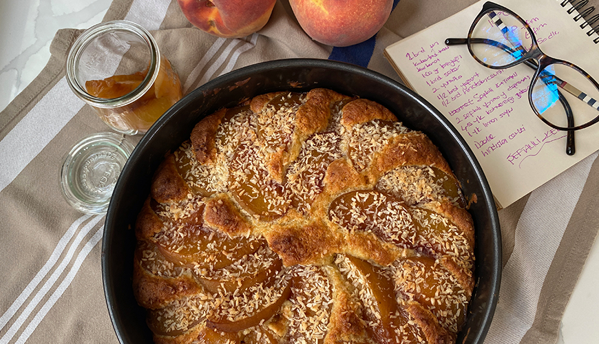 Üzerine hazırladığınız şeftalileri dizin ve şeftali katmanının üzerine Hindistan cevizi serpin.