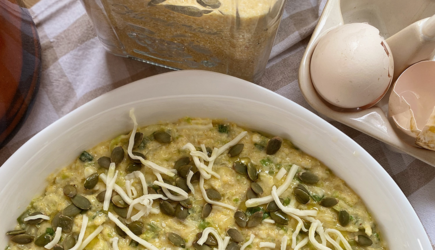 Üzerine, rende mozzarella (opsiyonel) ve çiğ kabak çekirdeği