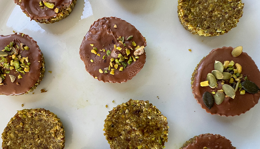 Çikolatanın üzerini Antep fıstığı ve kabak çekirdeği içi ile tatlandırın.