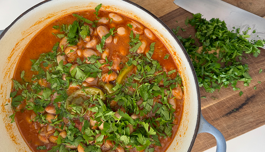 Sauté the onion in olive oil over high heat until it changes color and wilts. Add the tomato and sauté for 1-2 minutes. Add the kidney beans and stir. Place the peppers whole in the middle of the pot. Add enough water to cover the kidney beans (see reel). Add the spices and salt. When the dish starts to boil, reduce the heat as much as possible and let it cook. When the kidney beans soften and become part of the sauce, turn off the heat and let it rest. You will observe that it releases its oil during this time. Sprinkle parsley on top when it cools down.