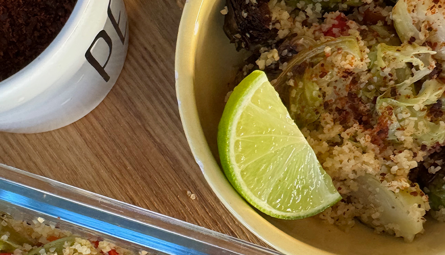İyice süzüp kuruladığınız brüksel lahanası ve birkaç yerine bıçakla delik attığınız kırmızı biberleri fırın tepsisine yayın. Zeytinyağı, sarımsak, tuz ve biberiyeyi bir sos kâsesinde karıştırıp sebzelerin üzerine fırça ile sürün. 200°C önceden ısıtılmış-üst ızgara fırın ayarında ızgara yapın. İlk 10 dk üzerini bir yağlı kâğıt ile kapatırsanız içi daha iyi pişer. Fırından çıkarınca kırmızı biberlerin kabuklarını soyup doğrayın.