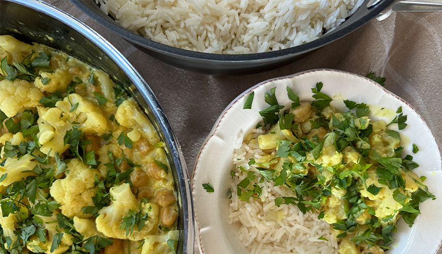 When the time is up, add the cauliflower and chickpeas. Cook with the lid open until the cauliflower is completely soft.