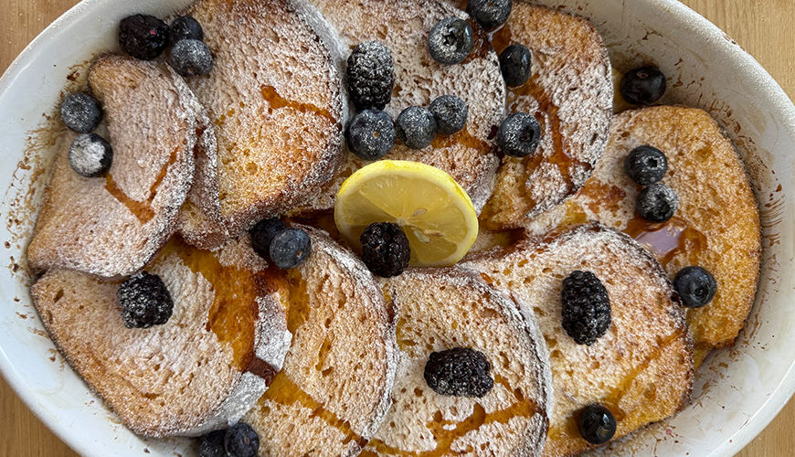 Let the French toast rest for 5 minutes after taking it out of the oven. When serving, sweeten with powdered sugar, fresh fruits and maple syrup/honey.