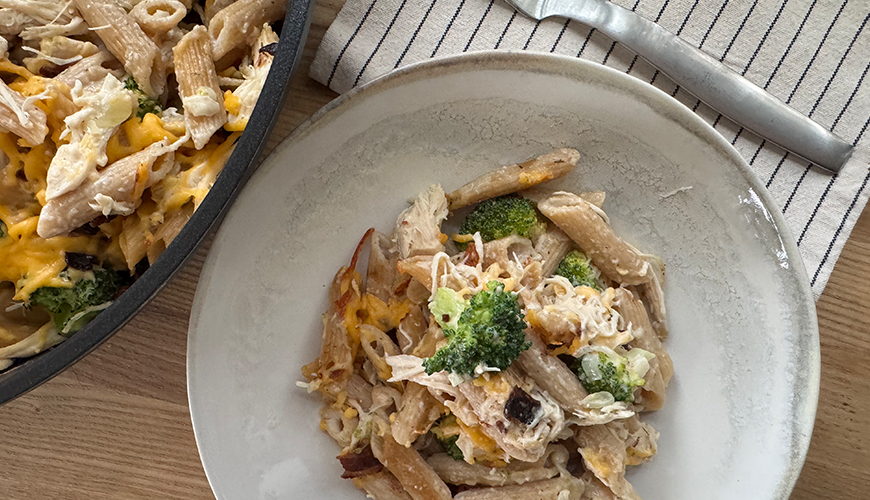 Tavuk suyu, süt, sarımsak tozu, soğan tozu, kurutulmuş dereotu, tuz ve karabiberi tencereye ekleyip karıştırın.Karışım kaynamaya başlayıp, hafifçe koyulaşana kadar sık sık karıştırarak pişirin. Hazır olunca ocaktan alın, 5 dk bekleyin, ilk sıcağını atınca tencereye makarna, brokoli karışımını, tavuğu, peynirin yarısı ve pastırmanın yarısını ekleyip tüm malzeme eşit dağılıp özleşene kadar karıştırın. Yüzeyini düzeltip kalan peyniri ve pastırmayı eşit şekilde serpin. Tencerenin kapağını kapatıp 175°C'ye önceden ısıtılmış fırında yaklaşık15-20dk pişirin. Son 3-5 dakikasında kapağı alıp peynirin erimesini sağlayın.