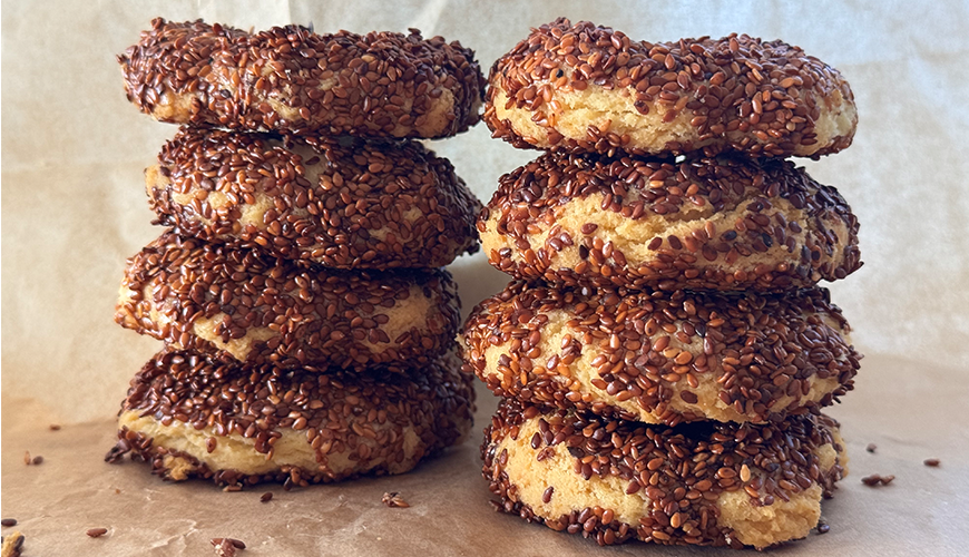 Dip the rings first in lightly beaten egg yolk, then in sesame seeds and place them on a baking tray covered with baking paper. I used roasted sesame seeds, we like a slightly roasted flavor. If you use raw, you will obtain lighter colored bagels.