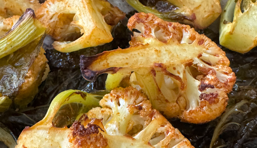 *After dividing the cauliflower in half, it is beneficial to soak it in ¼ cup vinegar and 1 tablespoon of baking soda for 15 minutes. After the time, drain it well. If you wash it the night before and put it in a strainer, all the water will be drained and even dried by the next day, and the preparation process will be much more practical.