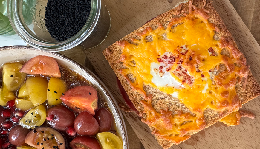 Place the egg toasts on a baking tray and cook in a preheated oven at 180°C with the upper and lower settings until the egg whites take on color. It is important for the egg yolk to remain fluid, so do not cook for too long, when the top layer turns white, remove from the oven, this takes about 5-8 minutes.