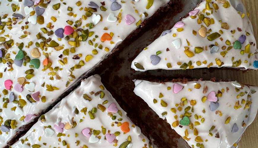 Remove the cake from the oven as soon as it cools down and when it has completely cooled, sweeten it with cream. You can decorate the cream with edible dried flowers or chocolate chips.