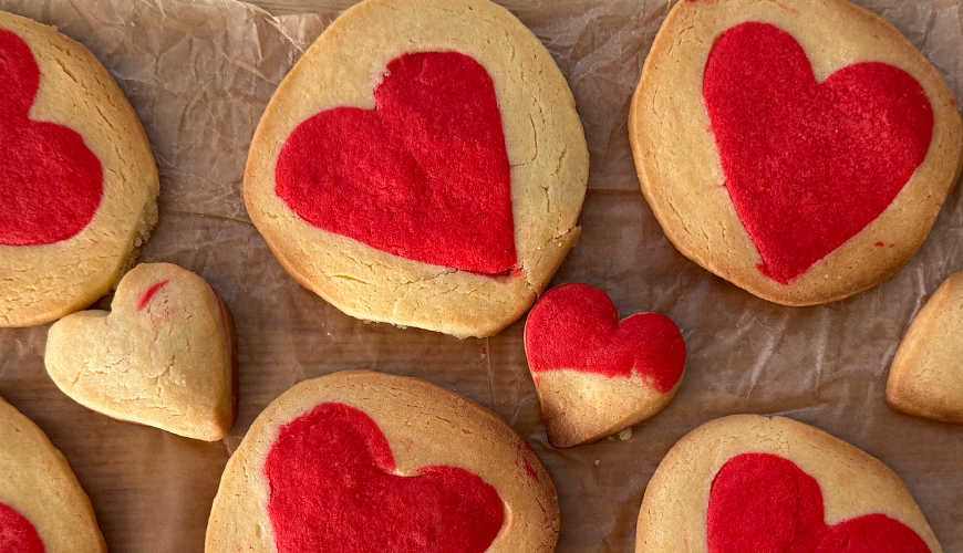 At the end of the time, take the red dough on a floured surface and roll it out to about 2cm thick. Cut out heart shapes using a cookie cutter and place them on a baking tray covered with greaseproof paper and let it rest in the fridge for 1-2 hours. At the end of the time, stack them on top of each other (see video). Roll out the other dough to 4cm thick and wrap it around the hearts, it doesn't matter if you wrap it all at once, there may be small spreads while wrapping, don't worry, gather the dough and continue, it is enough to try to create an equal thickness around the hearts. At the end of the wrapping process, wrap the cookie shape with wax paper/stretch to make it smooth, then place it on a work surface and define the shape of the roll with back and forth movements. Put the roll in the fridge and let it rest, preferably overnight or 2-3 hours.