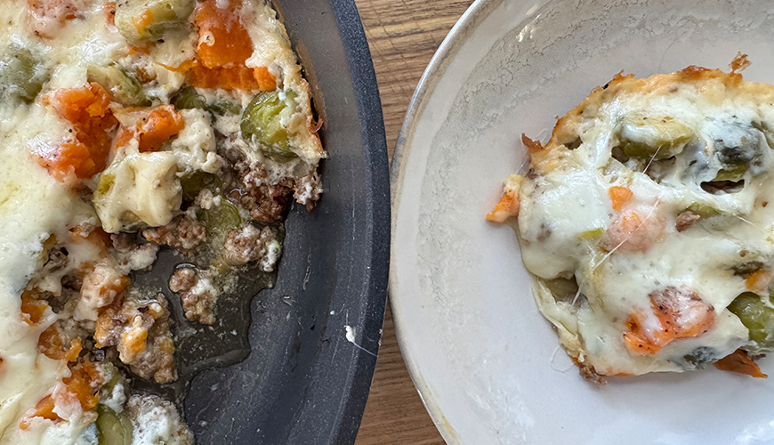 In a covered pot/deep pan that can also be used in the oven, sauté the ground meat until it releases and absorbs its water. When the oil is released, add the rosemary leaves and peppers and continue sautéing until the ground meat changes color. Remove from the stove, season with salt and pepper and add the Brussels sprouts and sweet potato to the pot and mix all the ingredients.