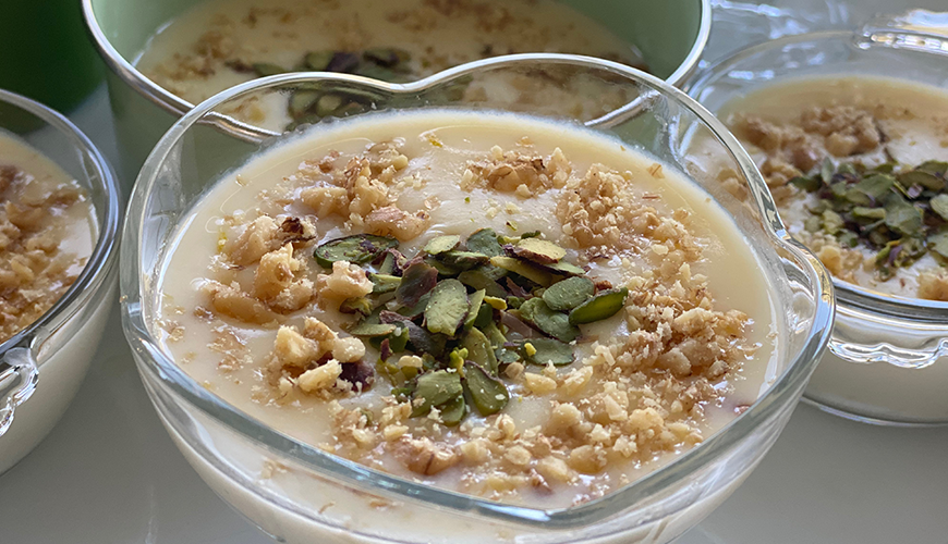 Sıcakken kaselere paylaştırın. Ilımaya başladığında üzerine tatlandırın ve dolaba kaldırın.