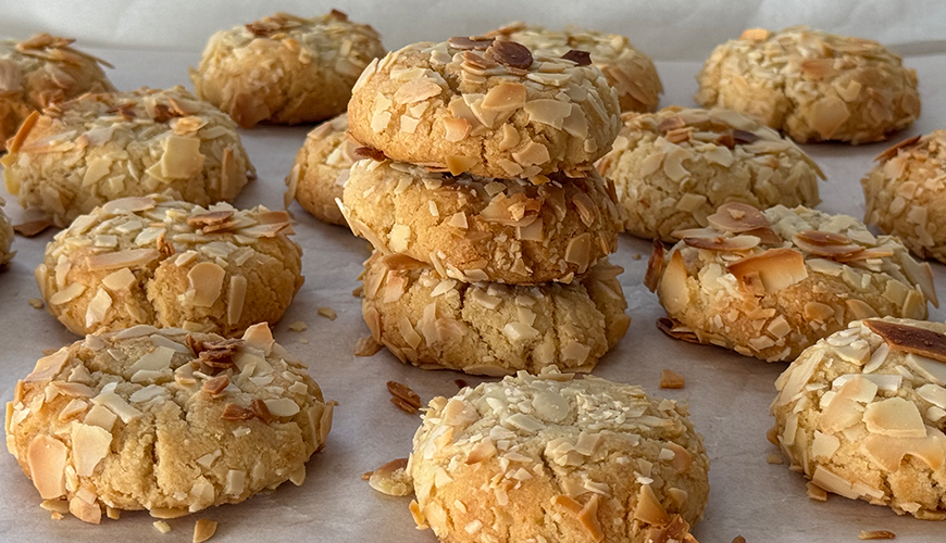 Take small balls from the dough and roll them in your palms. Then wet the balls with a little water in your palms or in a bowl with a little water at the bottom and cover them with sliced almonds and place them on a baking tray lined with greaseproof paper or a non-stick baking tray, 4-5cm apart. Finally, press them lightly with your fingers.