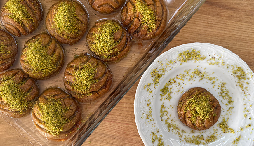 Let the dessert that comes out of the oven rest for 1-2 minutes and then pour the syrup over the desserts with a spoon, gradually pouring it over each dessert and let it rest at room temperature. If you can pour the syrup over the desserts with a spoon every 30-45 minutes, it will be much better for the syrup to penetrate the dessert. Finally, let's decorate it with pistachios and serve. Store the dessert in the refrigerator for a day at room temperature (maximum 24°C -26°C) for a longer time.