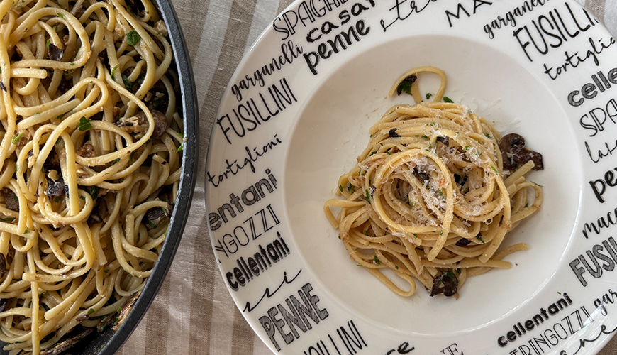 When the mushrooms change color and brown, add the walnuts, garlic, lemon zest and sauté all the ingredients together for a few more minutes.
